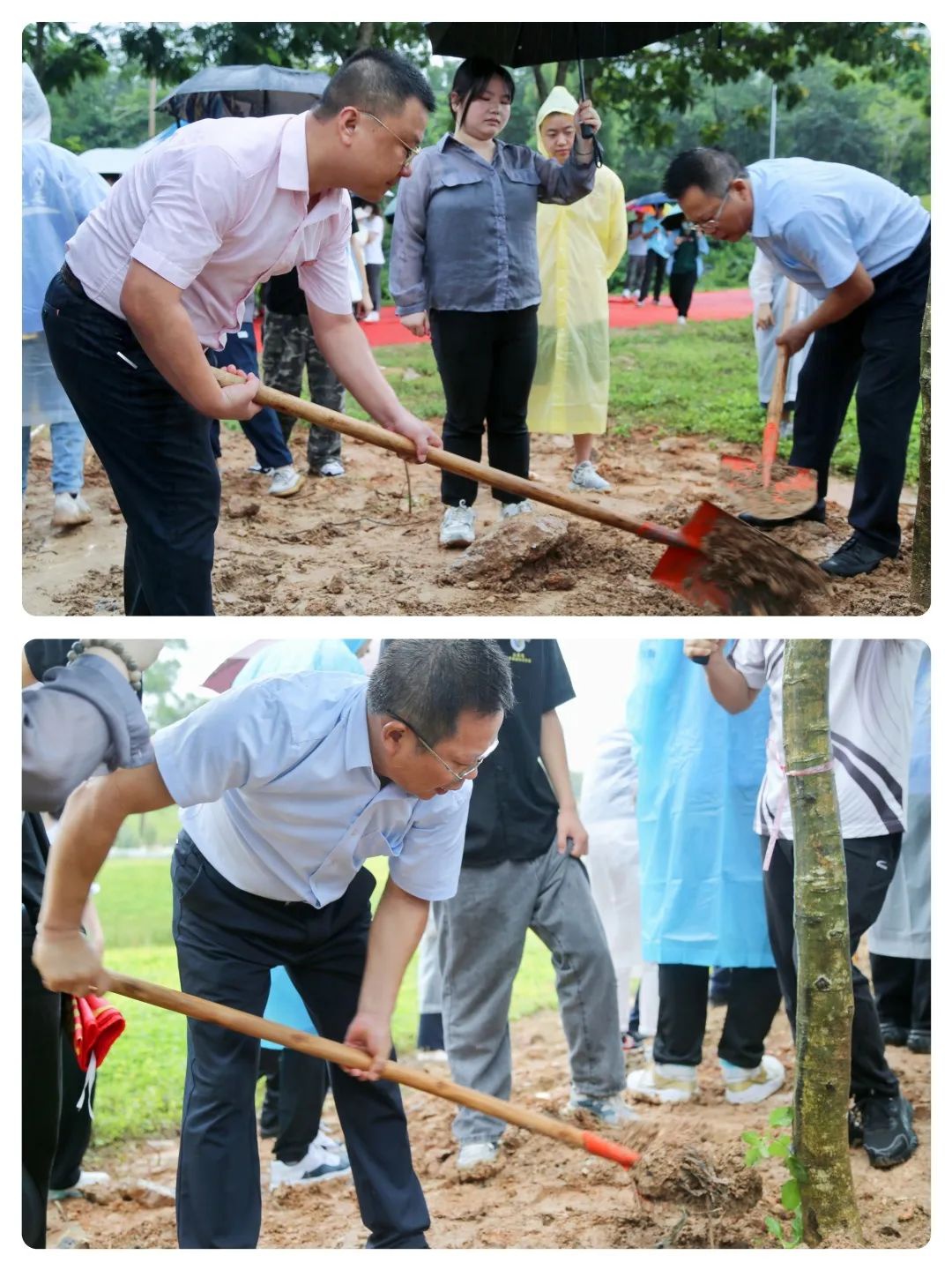 随后各学院党总支书记、团委书记及思想导师和毕业生代表,一起在雨中移步到书山馆西侧草坪凤凰林。必赢76net线路官网副院长刘雅斌、党总支副书记王翔、团委副书记曹添和毕业生代表分工合作,挥楸铲土、扶植苗木、回填细壤、夯实土层、提水浇灌。由于今日下雨,凤凰林土坡潮湿脚下易打滑,但大家毫不懈怠、分工明确,认真用双手种下象征成长的树苗。