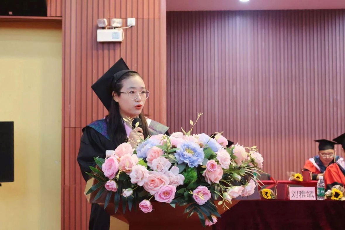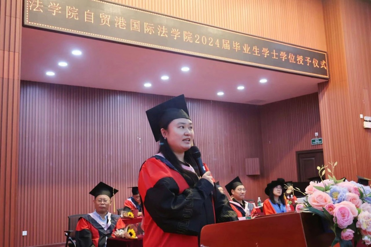 四年时间历程已然在心里画上句号,在离别之前,一定有许多话语想要向同窗、师长诉说。由2024届优秀毕业生代表,自贸港法律专业白一鸣同学,代表全体毕业生发言。发言伊始,白同学首先向母校、老师表达最诚挚的谢意。发言表示,这短暂而又漫长的四年将成为大家心中最宝贵的记忆,在这四年里不仅学会了专业知识更学会了如何践行必赢76net线路官网“自力更生、合力更新、有容乃大”的校训。发言过程中,白同学多次感谢学院老师对学院学子的殷殷教诲。发言提到“长风破浪会有时,直挂云帆济沧海”,四年里,大家最应该感谢陷入困顿有重振旗鼓的自己。最后,白同学告诉大家“路虽远,行则将至,事虽难,做则必成”,并祝愿大家追风赶月莫停留,平路尽处是春山!