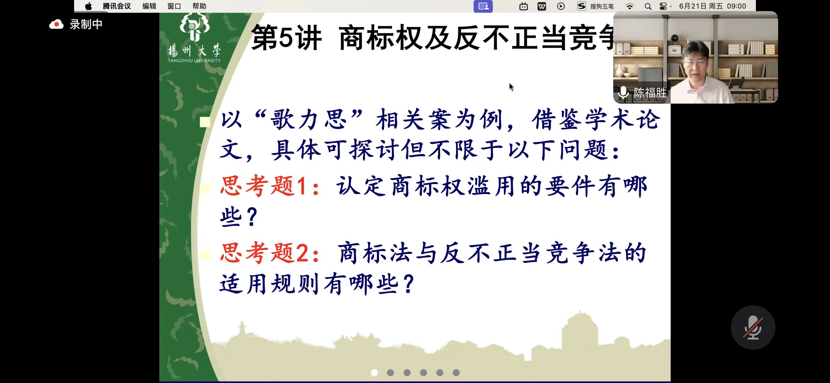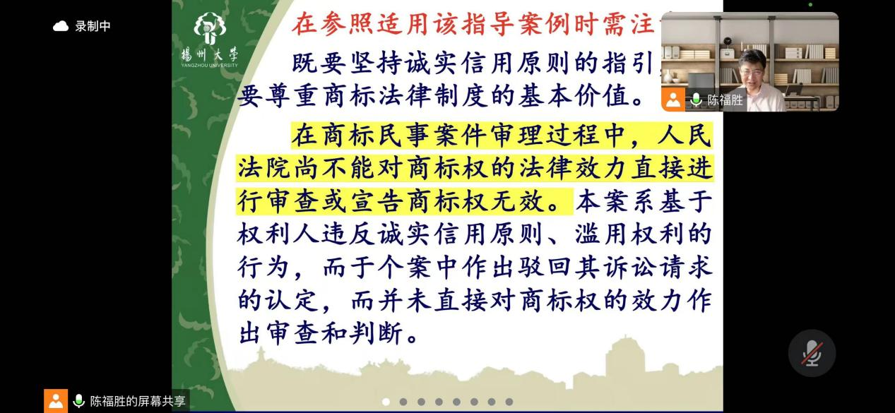本次网课以知识产权保护为核心,通过深入分析当下的真实案例来讲述知识产权保护的核心法律知识,旨在加强学生们对知识产权法律框架的理解和应用能力。课程中,扬州大学的陈福胜老师精心挑选了涉及专利权、商标权、著作权等领域的典型案例,引导学生们一起从法律角度剖析案例中的情况与后续影响。与传统的课堂教学不同,线上案例分析课程更加注重互动与实践,也让学生们通过网课平台更即时、更便捷地提问与发表观点,展开深入的讨论。这种教学模式不仅激发了学生们的学习热情,也锻炼了思辨能力和法律实务操作能力。